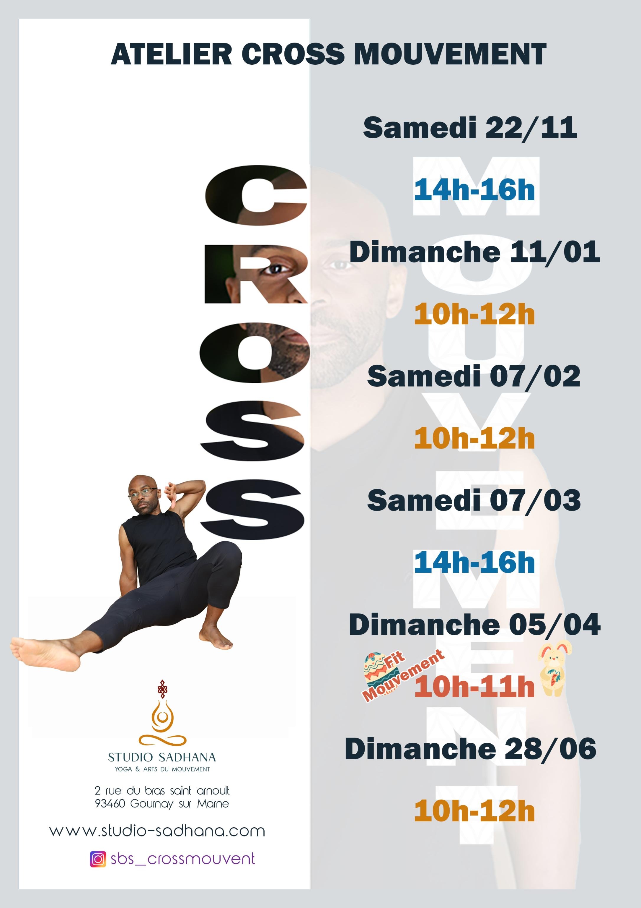 9h00-10h30 Yoga Iyengar - Alignement 12h30-13h30 Cross mouvement 18h00-19h00 Hatha Yoga 19h15-20h15 Hatha Yoga 20h30-21h30 Hatha Yoga